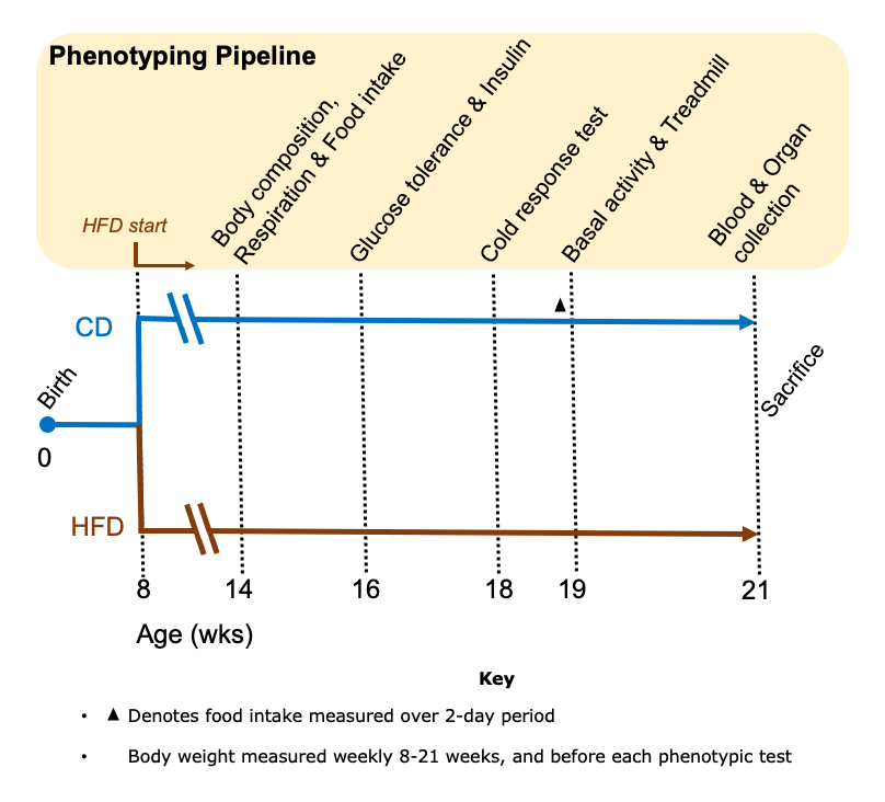 General Information for All Procedures: Fifteen cohorts of nine inbred mouse strains are fed either a CD or HFD diet in total, they are separated randomly into groups of five mice of each sex, for each diet. Strains are entered into the phenotyping program randomly, and are entered in a staggered entry, typically by 1 to 2 weeks.