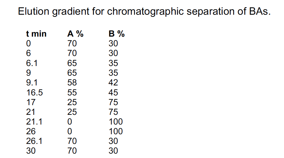 - BA's quantification is carried out with a LC-HRMS system (Vanquish Horizon ultra-high performance liquid chromatography (UHPLC) system coupled with a Q-Exactive Focus mass spectrometer interfaced with a HESI source, Thermo Fisher Scientific) operating in negative ionization mode. Chromatographic separation is carried out using an Acquity UPLC® HSS T3 1.8 µm 2.1 x 100 mm column. The mobile phase is composed of A = 5 mM Ammonium Acetate and 0.1% formic acid in H2O, and B = 0.1% formic acid in ACN. Gradient elution is set as described in the below table. The flow rate is 350 µL/min, column temperature 30°C, and the injection volume is 20 µL . Mass spectrometry parameters are set to: full scan in narrow mass range m/z 370-522, mass resolving power = 70,000 FWHM and AGC target = 5e5.
