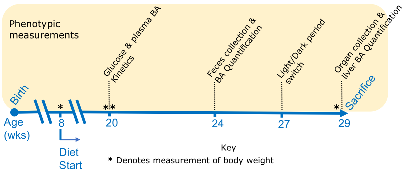 - Feces are stored at a temperature of -20°C for bile acid quantification analysis (see below), and this test is carried out when the mice are 24 weeks of age.