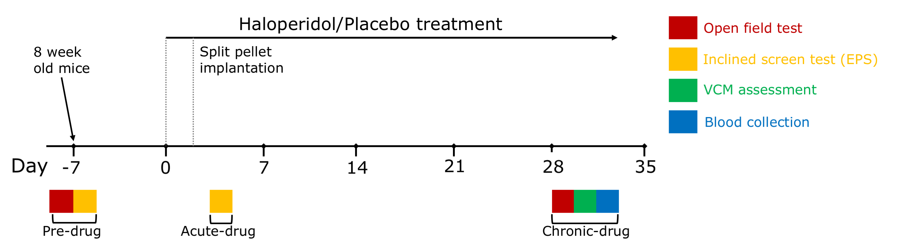- Mice are implanted with slow-release haloperidol pellets or placebo at approx 8 weeks (-/+ 7 days) and treated for approximately 30 days. Haloperidol pellets (3.0 mg/kg/day) are implanted subcutaneously with a trocar under 2 min of isoflurane anesthesia. Two pellets of incremental dosage are implanted 2 days apart. Placebo-treated mice are implanted with pellets containing the same matrix material but no drug.